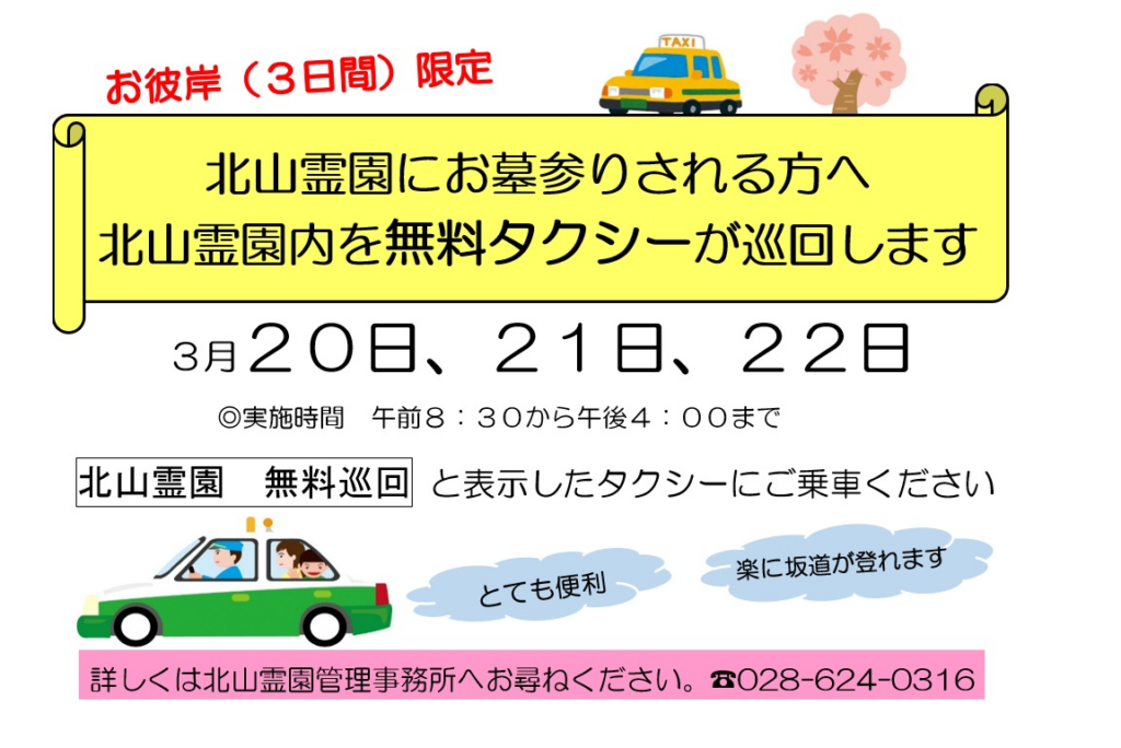北山霊園では、お彼岸期間中に北山霊園園内の無料タクシーが巡回いたします。